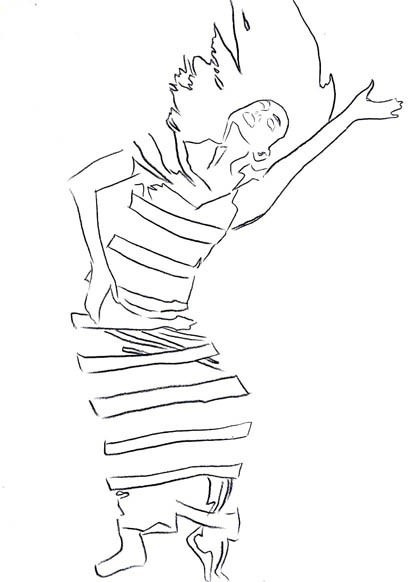 Torso placed in parallel position with the floor, one arm following its line, the other bent, its wrist on the dancer’s head. Her eyes are closed and the tension of her movement is visible through her exposed neck. The wide skirt of her white dress defines the movement of her legs, one being rooted on the floor and the other forcefully thrown behind her in a striking kick. Both the horizontal line of her torso and the vertical curve of her skirt contribute to the kinetic idea of her step.